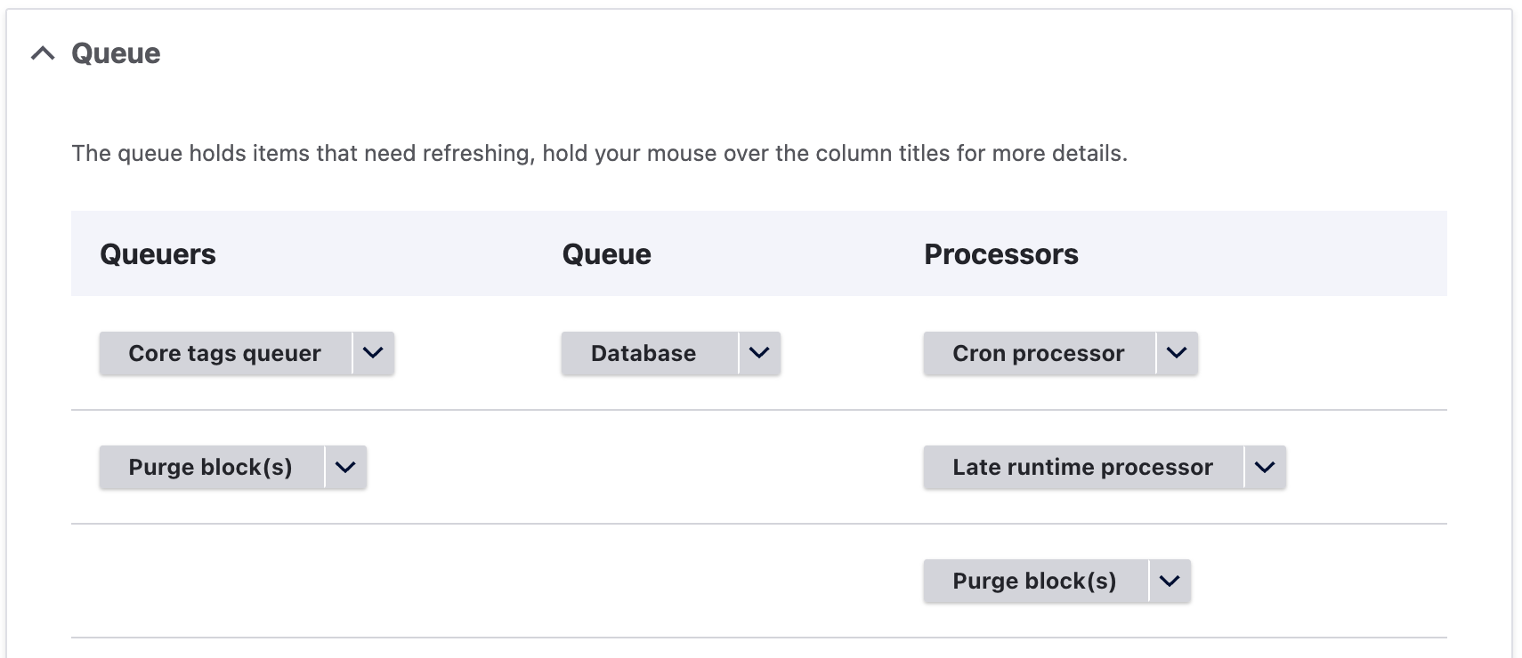What this means is that we will be using Drupal's built-in core tag queuer (add tags to the queue), the queue will be stored in the database (default), and the queue will be processed by
