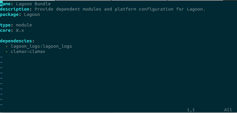 Here we open web/modules/contrib/lagoon/lagoon_bundle/lagoon_bundle.info.yml and add clamav:clamav as a dependency: