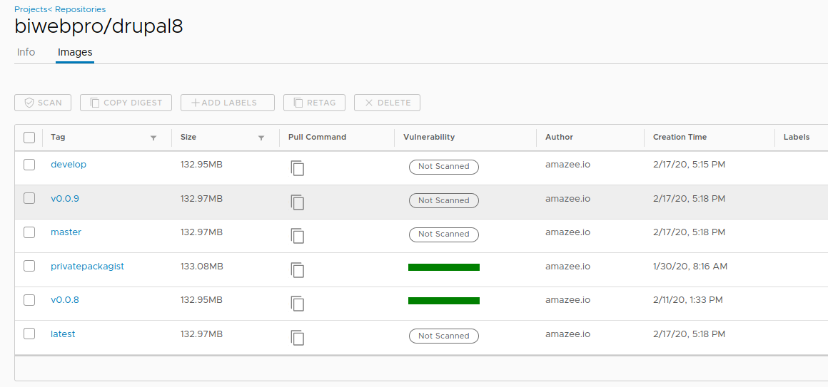 In this section we will demonstrate the process of updating and tagging a new release of the Drupal 8 base image. We will add a new module (ClamAV) to the base. We’re demonstrating on Drupal because it has the most complex setup of the base images. The steps that are common to every base image are noted below.