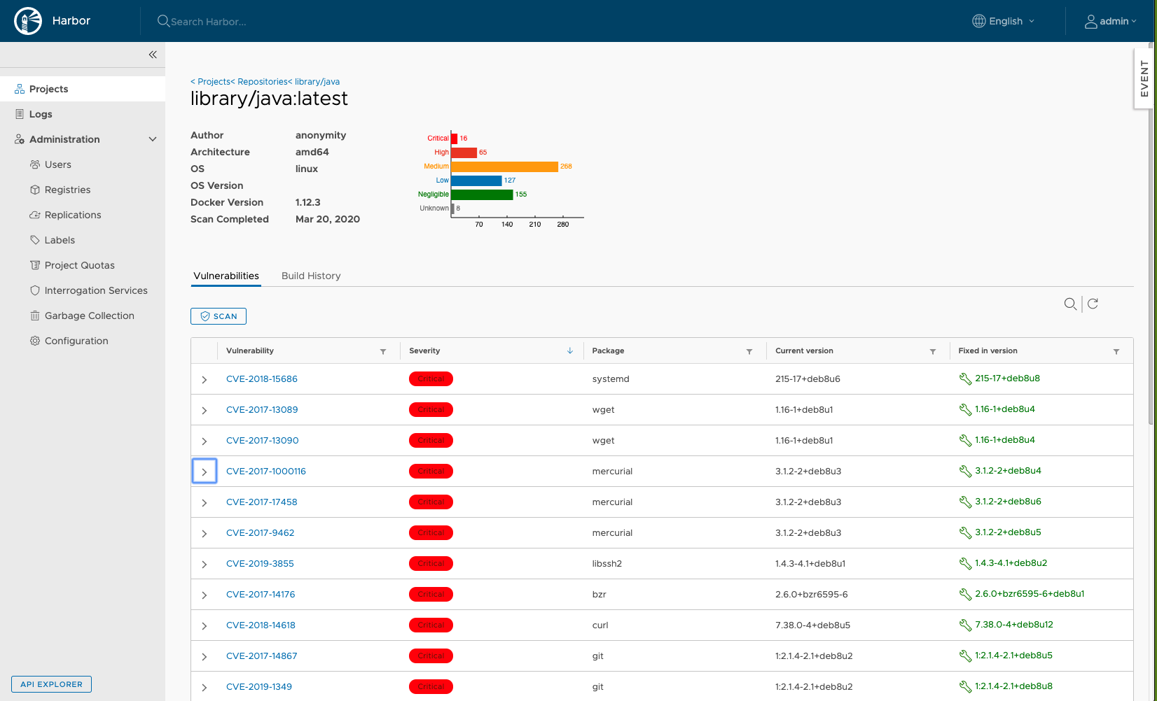 An example of a security scan in Harbor, showing applicable vulnerabilities for a scanned container: