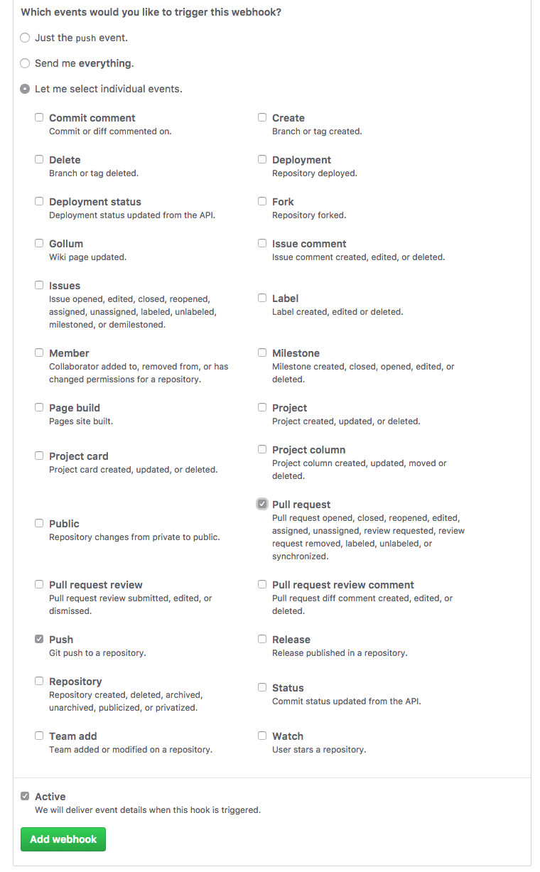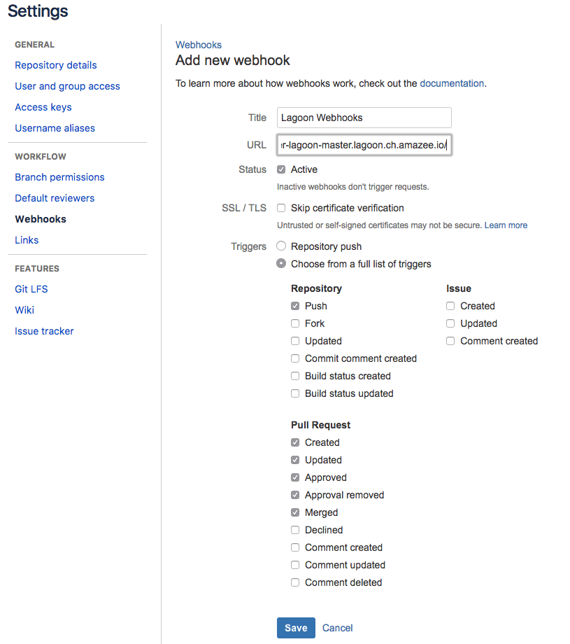 Your Lagoon administrator will also give you the route to the webhook-handler. You will add this to your repository as an outgoing webhook, and choose which events to send to Lagoon. Typically, you will send all push and pull request events. In Lagoon it is possible to add a regular expression to determine which branches and pull requests actually result in a deploy, and your Lagoon administrator can set that up for you. For example, all branches that start with feature- could be deployed to Lagoon.