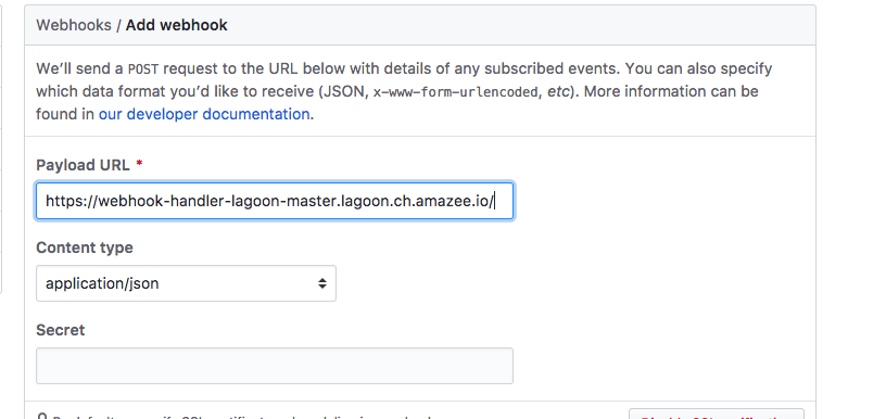 Payload URLis the route to thewebhook-handlerof your Lagoon instance, provided by your Lagoon administrator. - Set