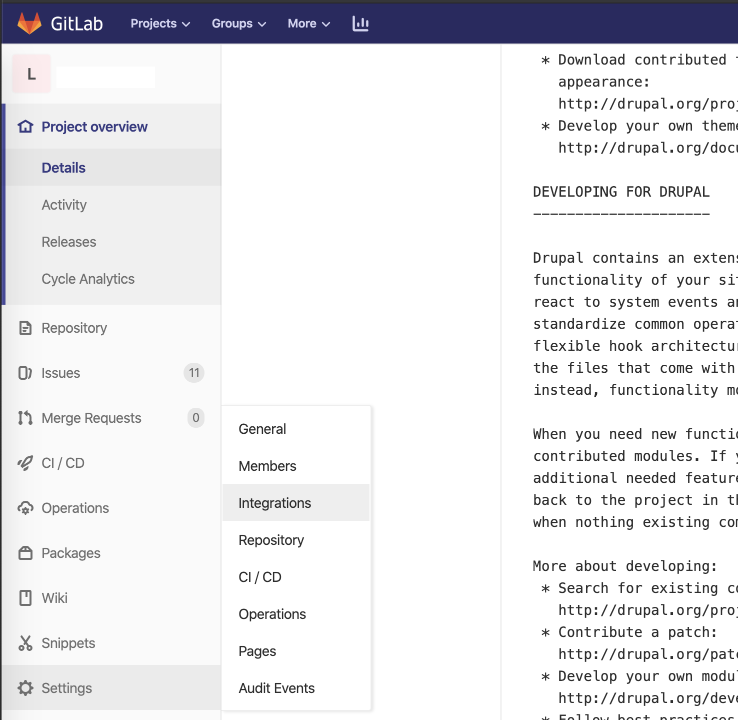 - Navigate to Settings -> Integrations in your GitLab repository.