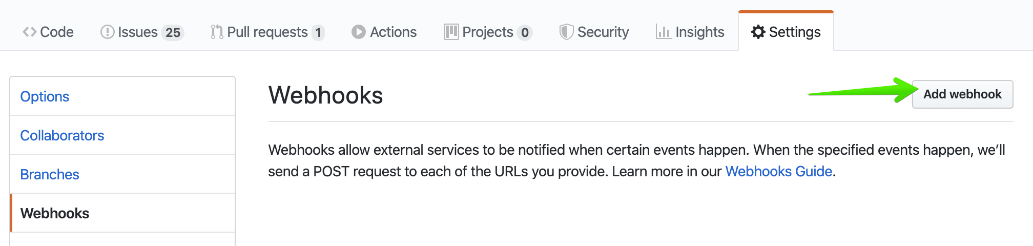 - Navigate to Settings -> Webhooks -> Add new webhook in your repository.